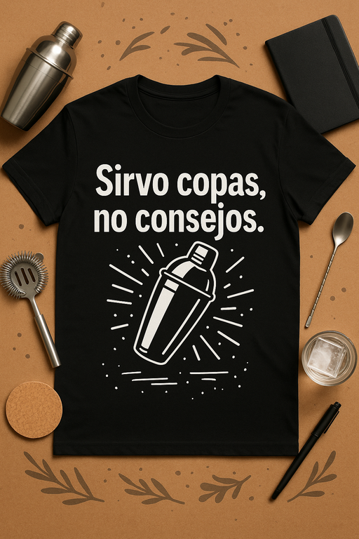 Eres quien agita la noche y llena copas, no oídos. Con esta camiseta unisex Sirvo copas, no consejos, tu mensaje llega antes que el primer brindis: aquí se sirven bebidas, no sermones.