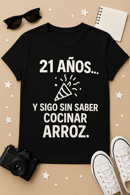 Si a los 21 aún confundes el temporizador con el cronómetro del gym, esta camiseta es tu plato fuerte. “21 años… y sigo sin saber cocinar arroz” es la declaración oficial de los chefs del microondas, los maestros del delivery y los reyes del tupper de mamá.