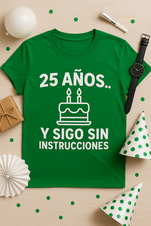 Llegaste a los 25 y el mundo sigue sin darte un manual. Tranquilo, esta camiseta lo explica todo con humor y estilo. Ideal para celebrar tu cumpleaños, para regalar a ese amigo caótico adorable o para usar en la fiesta donde te preguntarán dónde la compraste.