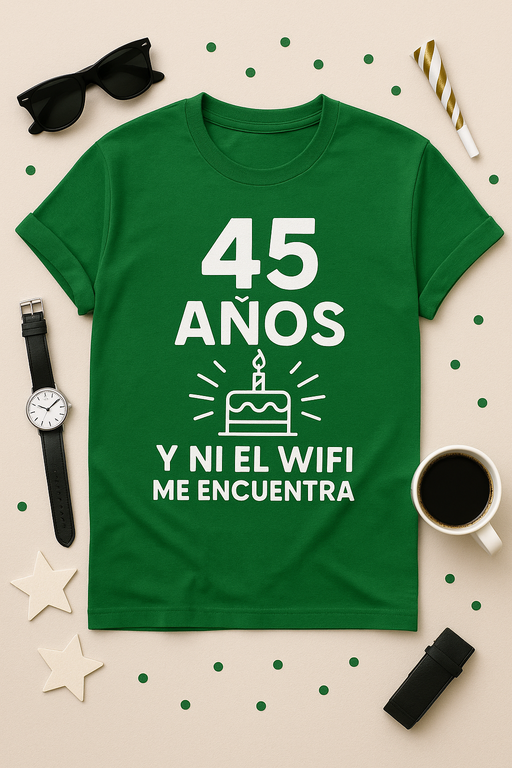 Si el WiFi no te encuentra a los 45, será porque estás fuera de cobertura de dramas. Esta camiseta es tu señal definitiva: cómoda, divertida y lista para levantar sonrisas en cada reunión, oficina o fiesta de cumpleaños.