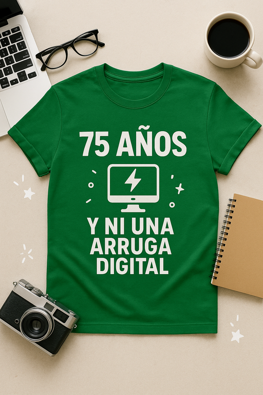 ¿Cumples 75 y sigues sin una arruga… digital? Esta camiseta es tu certificado oficial de experiencia HD. Ideal para sabios tech, abuelos con Wi‑Fi propio y veteranos que siguen a 120 FPS en humor.