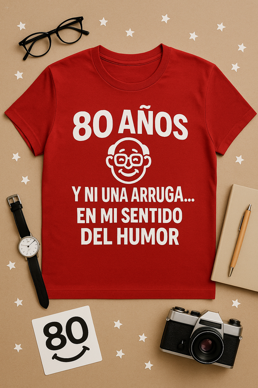 A los 80, las arrugas vienen y van, pero el humor queda impecable. Camiseta suave y divertida para celebrar que tu chispa sigue planchada.
