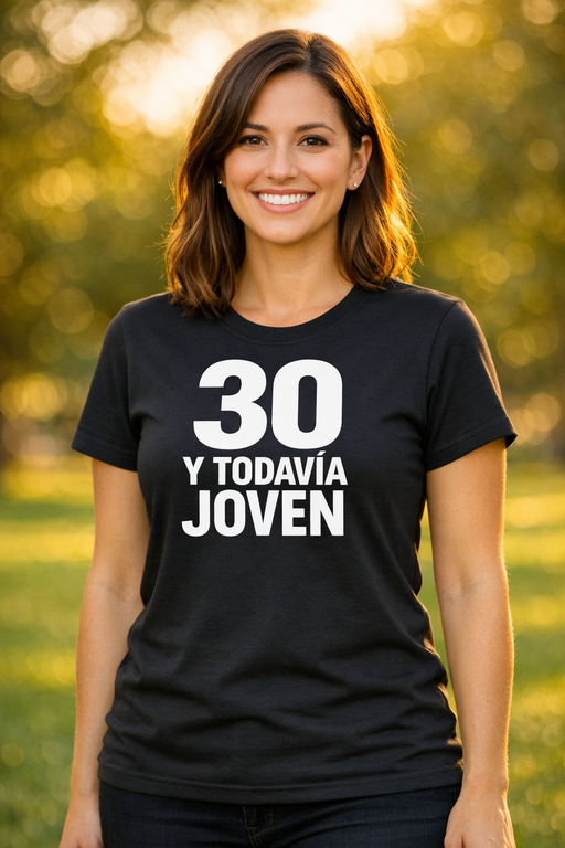 Los 30 no son una crisis: son un upgrade con más actitud y mejor humor. Esta camiseta negra entallada con el mensaje 30 Y TODAVÍA JOVEN deja claro que la fiesta acaba de empezar.
