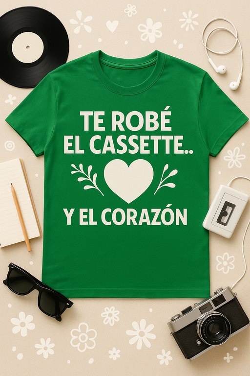 Si alguna vez pausaste la radio para que no se grabara la publicidad, esta camiseta es tu himno. Te robé el cassette… y el corazón une humor, nostalgia y una declaración de amor tan suave como su algodón.