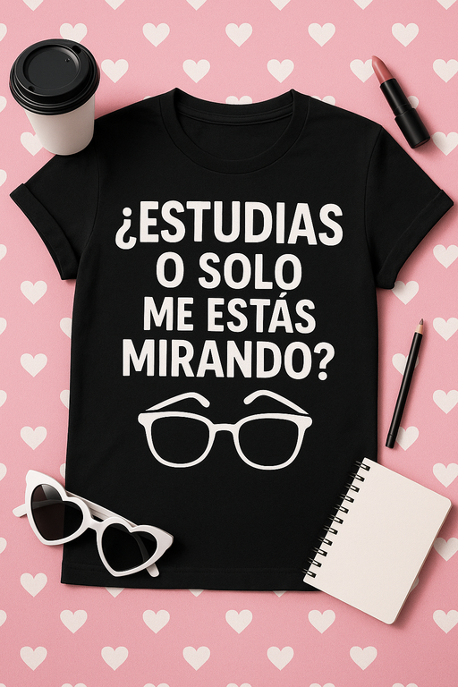 Haz que el recreo, la biblioteca o la primera cita empiecen con una sonrisa. Con esta camiseta ¿Estudias o solo me estás mirando? no tendrás que hacer el primer movimiento: el texto lo hace por ti.
