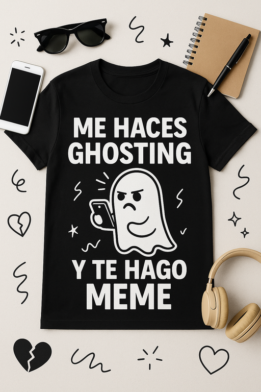 ¿Te clavan el visto? Con esta camiseta lo conviertes en contenido viral. Diseño fresco con la frase Me haces ghosting y te hago meme: una declaración de principios para amantes del humor, las redes y el arte de responder sin responder. Tejido suave de alta calidad, impresión nítida y duradera, corte unisex que sienta bien en cualquier plan: citas, brunch, oficina o scroll infinito. Ideal para regalar a esa persona que siempre tiene el meme perfecto en la galería. Disponible en varias tallas y colores, fácil de combinar y lista para romper el hielo allá donde vayas. Súmate al trend, añade al carrito y que empiece la comedia romántica versión meme.