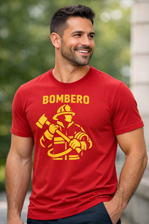 Cuando suena la alarma, aparece el BOMBERO: una camiseta roja con diseño amarillo potente que presume de orgullo y actitud, perfecta para destacar en cualquier plan.