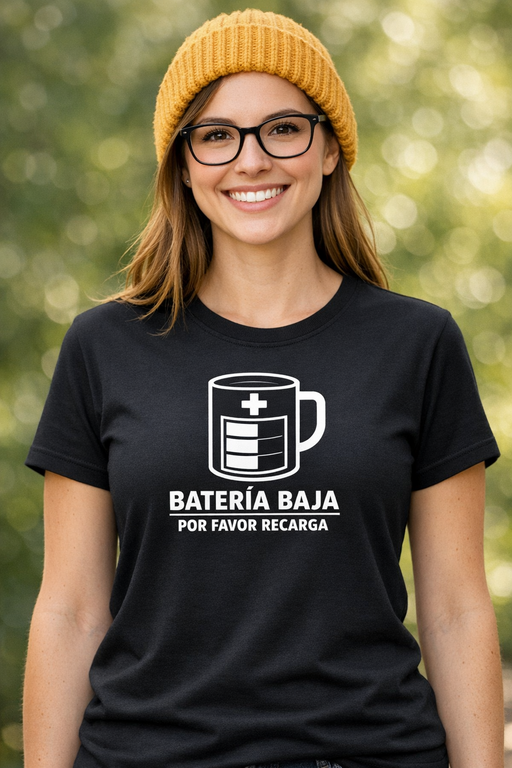 Cuando vas al 1% de energía, que se note. Esta camiseta negra con el mensaje «BATERÍA BAJA, POR FAVOR RECARGA» es perfecta para amantes del café, madrugones y días interminables.