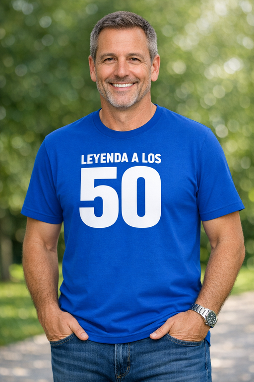 Porque a los 50 se celebra a lo grande: esta camiseta azul con LEYENDA A LOS 50 es tu sello de orgullo, buen rollo y humor del bueno.