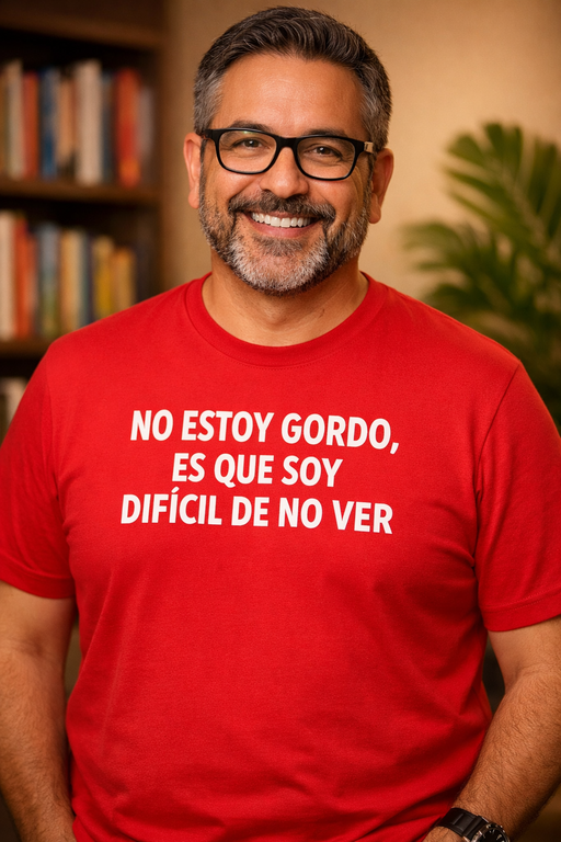Porque dice lo que muchos piensan con un toque de (auto)ironía: NO ESTOY GORDO, ES QUE SOY DIFÍCIL DE NO VER. El contraste del blanco sobre rojo destaca a lo grande y garantiza risas en cuanto entras por la puerta.