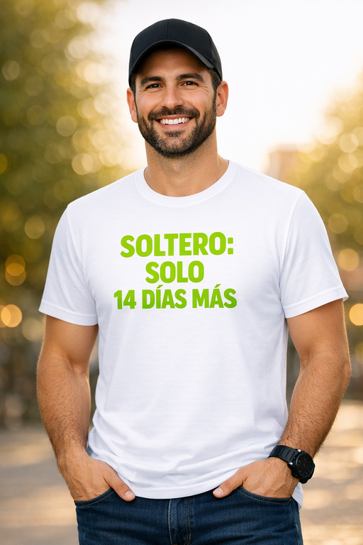 Porque dice lo que todos están pensando: Soltero: solo 14 días más. Llama la atención, anima el ambiente y queda brutal en fotos de grupo y momentos “última vez como soltero”.