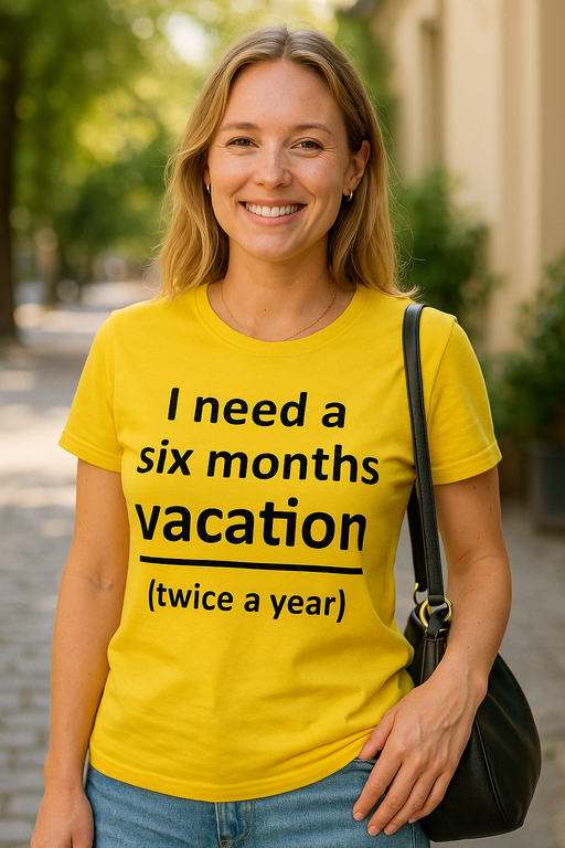 🌴 En voz alta, pero con sonrisa: I need a six months vacation (twice a year)! Esta camiseta amarilla de manga corta, con cuello redondo e impresión en negro, dice exactamente lo que todos pensamos.