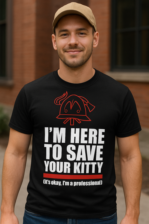 Para todos los héroes que rescatan gatos, vecinos y el mal rollo. El contraste de letras en blanco y rojo y el casco de bombero en el pecho dejan claro: el profesional está en la casa.