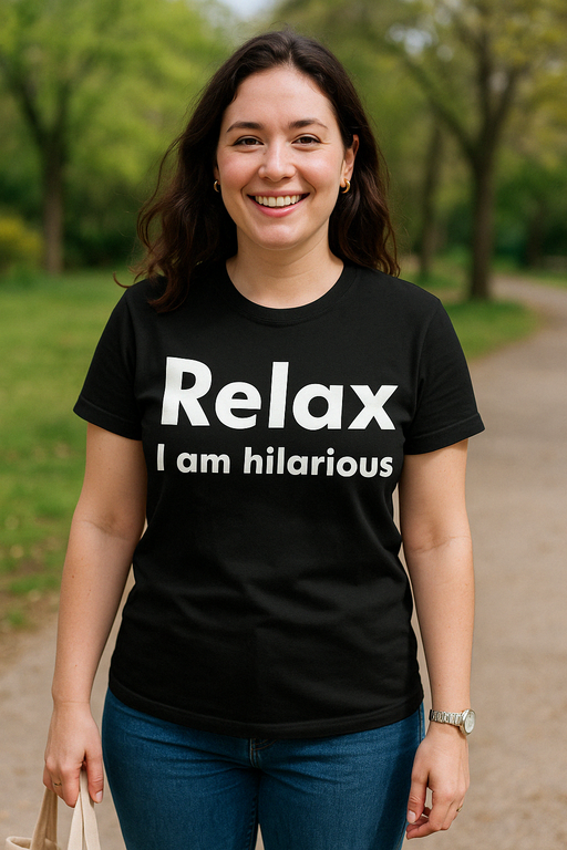 Relájate, que aquí se viene a reír. 😄 Camiseta negra de manga corta con el mensaje ‘Relax I am hilarious’ que anuncia tu comicidad antes de hablar. Perfecta para stand-up, bromistas de oficina y ese amigo que se cree el más gracioso. 🎁