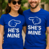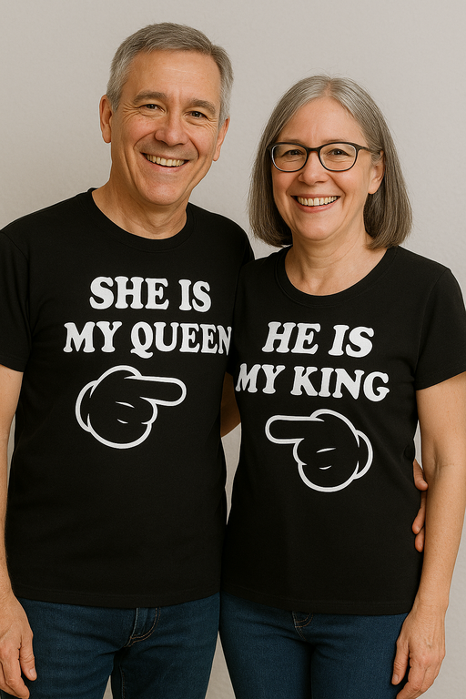 👑 Cuando él y ella forman un dúo real, que lo sepa el mundo: SHE IS MY QUEEN / HE IS MY KING. Dos camisetas negras de manga corta con una gráfica divertida del dedo señalando lo dicen todo antes de que nadie pregunte “¿quién va con quién?”.
