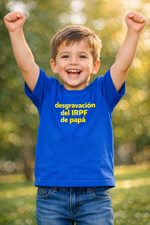 Porque convierte la vida familiar (y la declaración) en una broma genial: el peque luce con orgullo “desgravación del IRPF de papá” y las risas están garantizadas en fotos, parque y guardería.