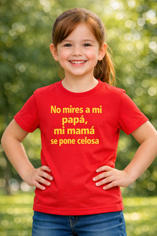 Una frase traviesa y adorable que roba sonrisas allá donde vayáis: «No mires a mi papá, mi mamá se pone celosa». El contraste del rojo con el amarillo hace que el mensaje se lea a la primera y convierte cualquier plan en un momento divertido.