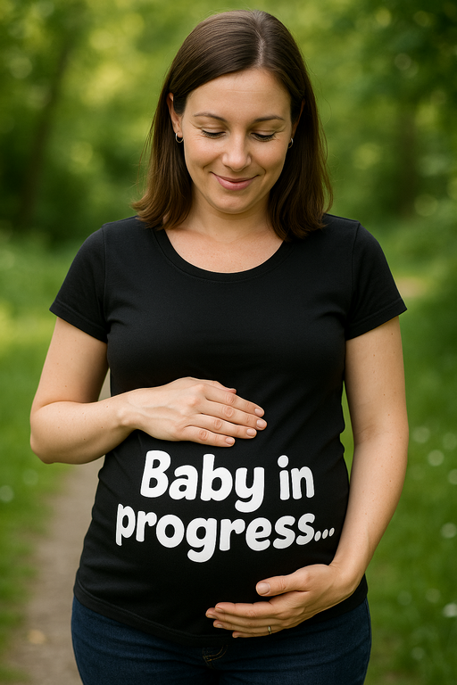 ¡Barriguita en obras! 🤰💻 Esta camiseta premamá negra con estampado blanco Baby in progress… provoca sonrisas y miradas tiernas. Ideal para futuras mamás con mucho sentido del humor.