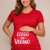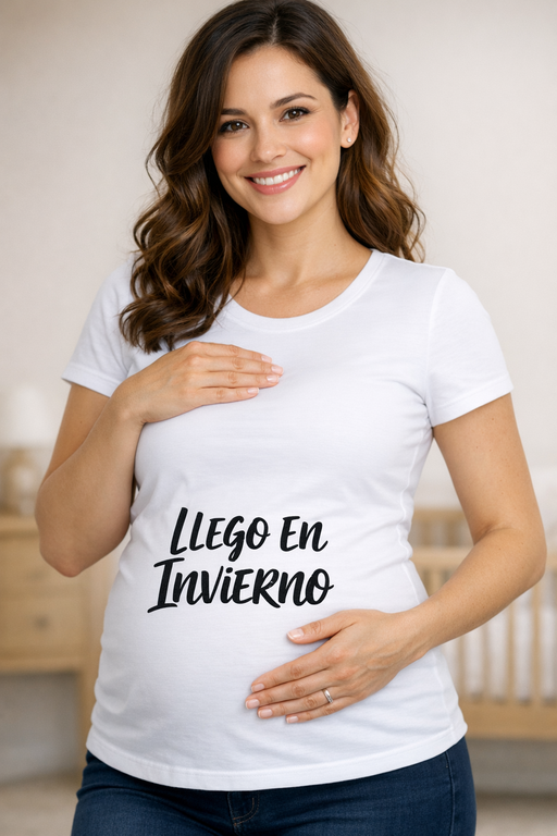 Tu tripita ya tiene anuncio oficial: «Llego en invierno». Una camiseta premamá blanca divertida y tierna para decir la fecha sin dar explicaciones. Ideal para fotos, quedadas y baby showers.