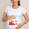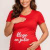 Esta camiseta premamá roja con el mensaje «Llego en junio» anuncia tu fecha de llegada mejor que cualquier calendario: clara, divertida y perfecta para fotos, paseos o incluso la oficina.