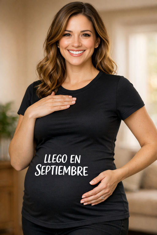 Esta camiseta premamá negra de manga corta es la forma más simpática de soltar la gran noticia sin decir ni una palabra: Llego en septiembre. Cómoda, favorecedora y perfecta para sacar sonrisas en cada “¿qué pone ahí?”.