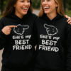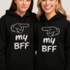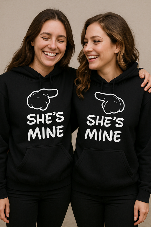 👉 Amor a primera vista… y al primer dedo: SHE’S MINE. Dos sudaderas negras con capucha y la icónica mano señalando lo dicen todo antes de que nadie pregunte: ¿Sois pareja?
